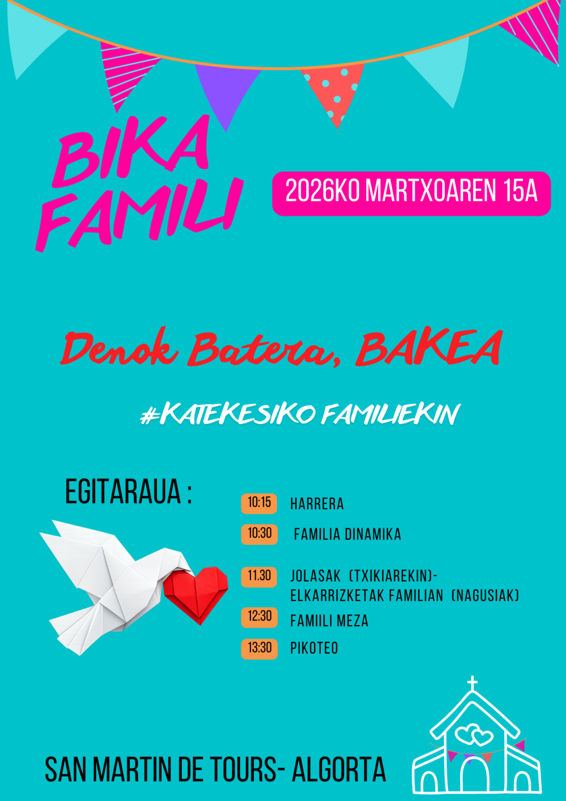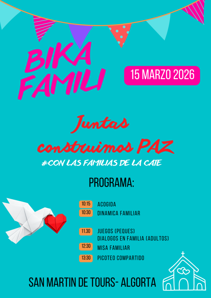 Un año más o podemos invitar a participar en el 3er encuentro con Familias de la Cate “BIKA FAMILI”. Como otros años será en la parroquia de San Martin de Tours en Algorta, muy cerca de la estación de metro que lleva ese nombre. Os dejamos aquí el plan. Animaos a participar. Estarán familias de Erandio, Astrabudua, Leioa, Las Arenas-Romo, Getxo, Uribe Kosta, Mungia y Txorierri.
